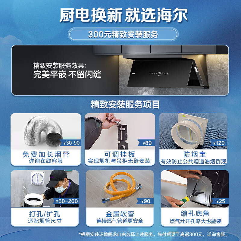 5、“海尔超薄平嵌油烟机”非常棒,配送及时,安装迅速,虽然因为我的橱柜太高了,没办法做平嵌安装,师傅仍然尽心帮我调整,效果更好。