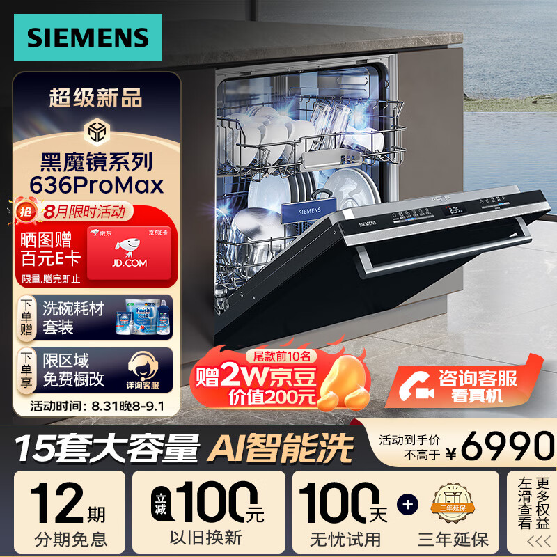 西门子黑魔镜【636ProMax】15套AI智能洗智能开门烘干168小时抑菌存超一级水效嵌入式洗碗机带消毒一体价格:6989.00元!