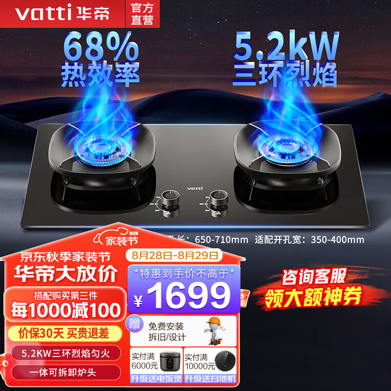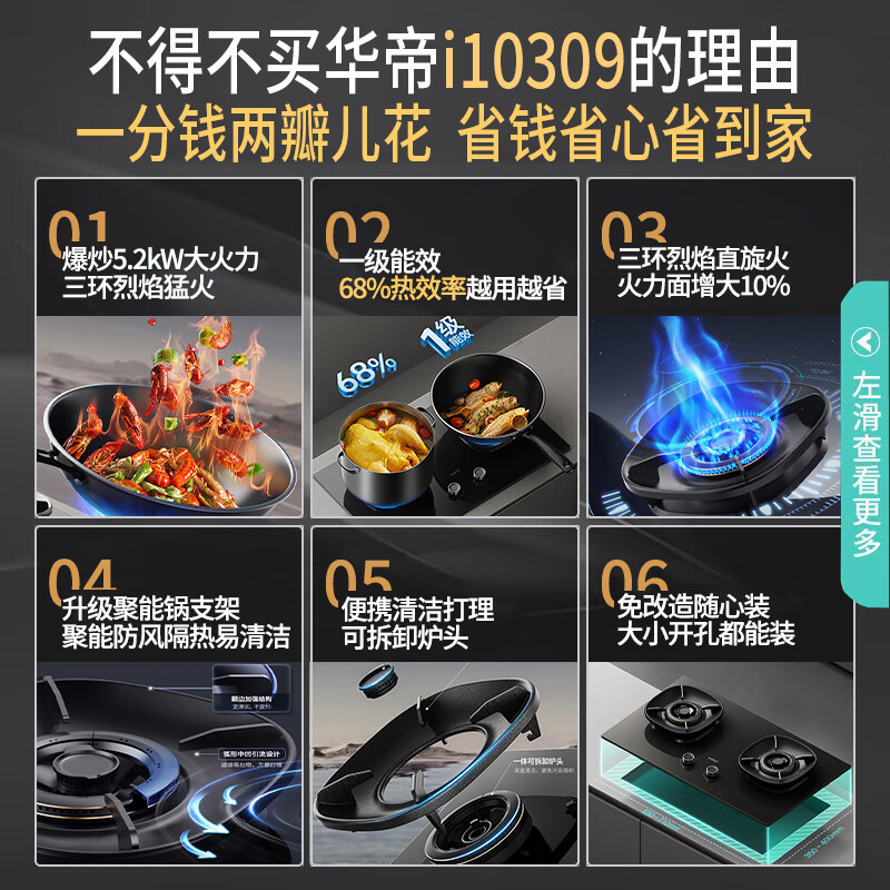 华帝(VATTI)家用燃气灶官方i10309台嵌两用5.2kw三环火力聚能盘68%超高热效率双灶具可拆卸炉头可调节开孔尺寸 【2024新款5.2kW】i10309 液化气5.0kW价格:1999.00元!