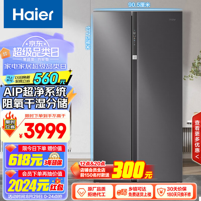 海尔(Haier)630升风冷无霜对开门双开门电冰箱家用一级能效变频节能智能除菌净味超大容量BCD-630WGHSS95SMU1价格:4499.00元!