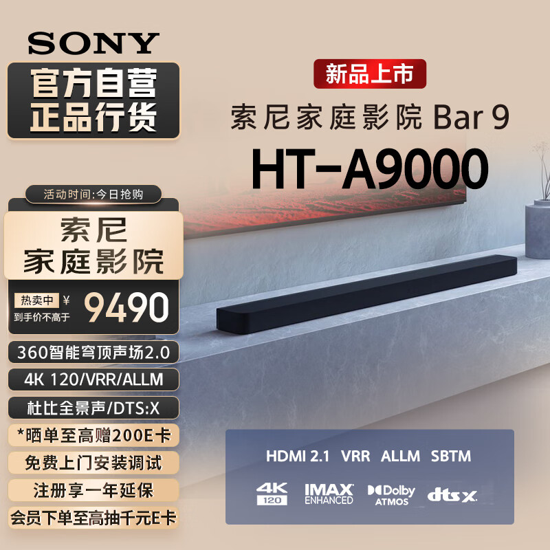 索尼(SONY)HT-A9000 全景声 单独回音壁 360智能穹顶 4K/120Hz VRR ALLM 家庭影院 Soundbar 电视音响 蓝牙价格:9490.00元!