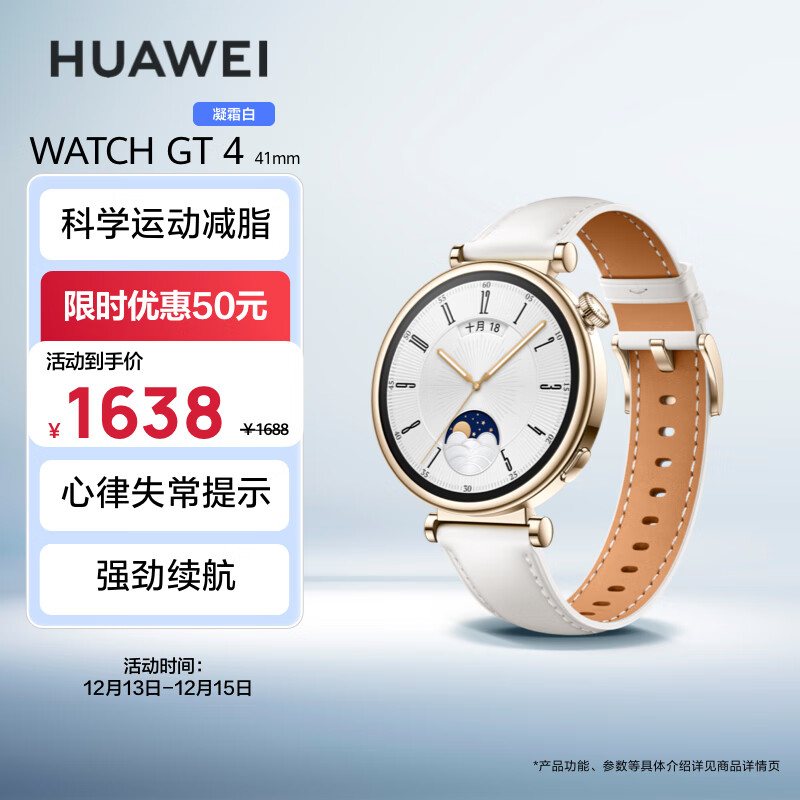 华为 HUAWEI WATCH GT 4 白色真皮表带 41mm 凝霜白价格:1638.00元!