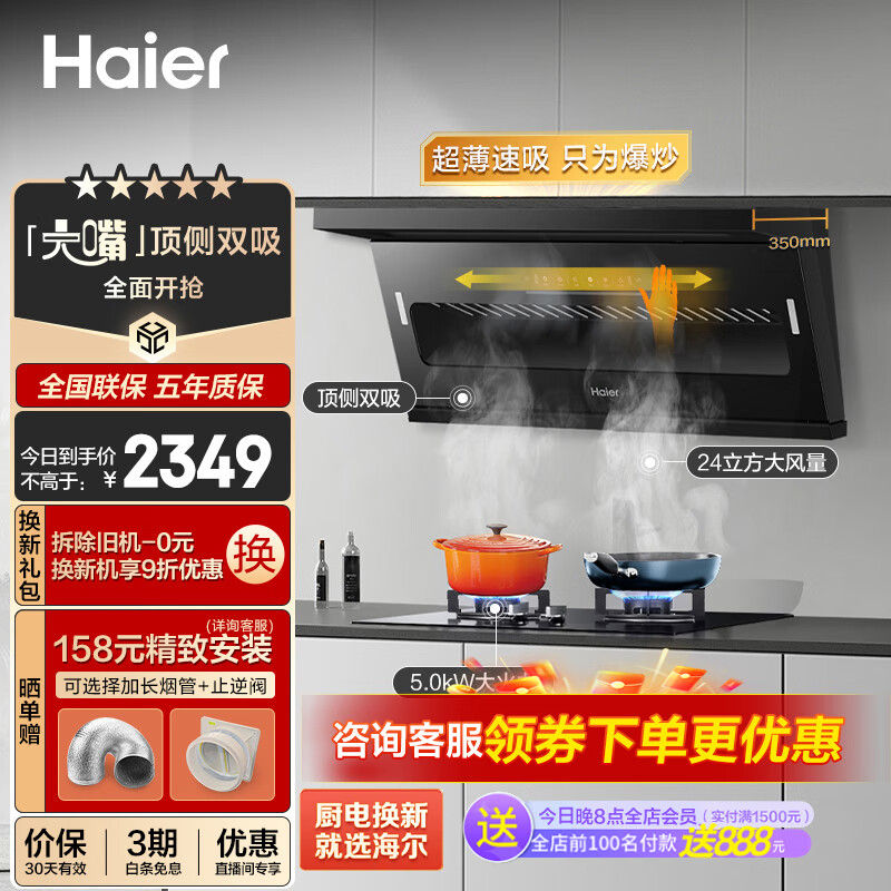 海尔(Haier)抽油烟机 顶侧双吸烟灶套装 24m3/min大吸力 5.0kw家用厨房吸油烟机燃气灶具套装C51+Q2BE2天价格:2349.00元!