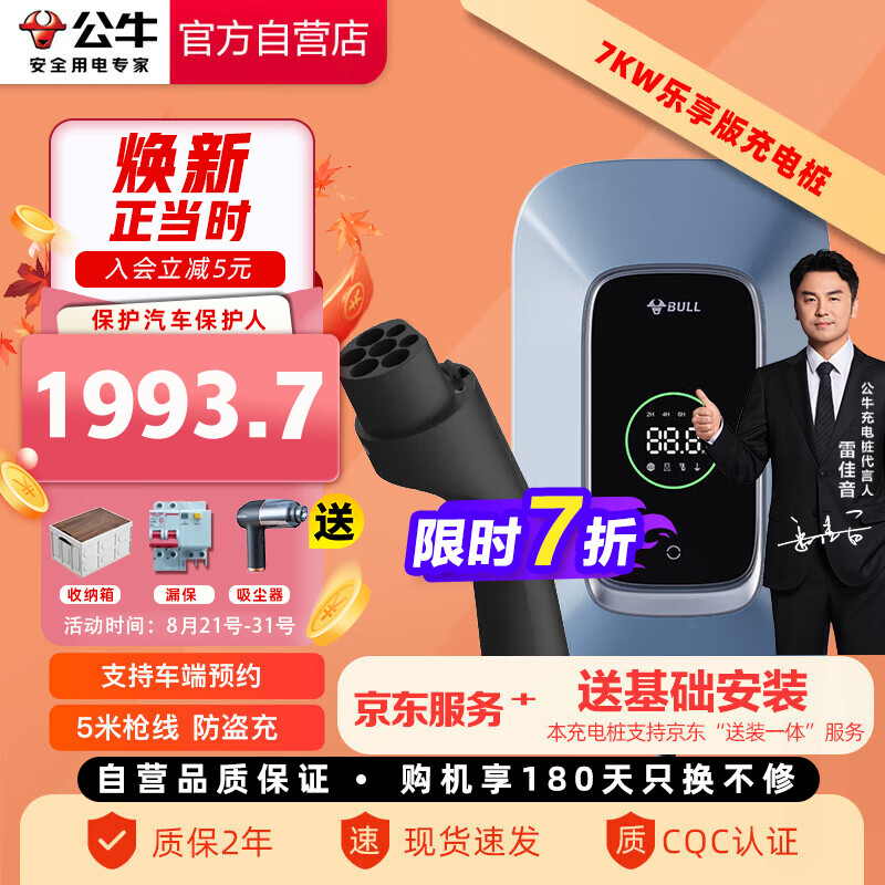 公牛(BULL)新能源汽车交流充电桩适配于小米su7汽车特斯拉比亚迪问界小鹏蔚来 7KW乐享款含基础送装一体价格:2849.00元!