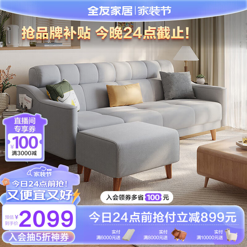 全友家居 北欧简约科技布艺沙发客厅三人位小户型可折叠沙发床102265价格:2998.57元!