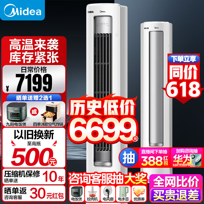 美的大3匹 新一级能效 静优风柜机变频冷暖两用客厅空调大风量家用大风口强劲风商用餐厅方形立式空调价格:6699.00元!