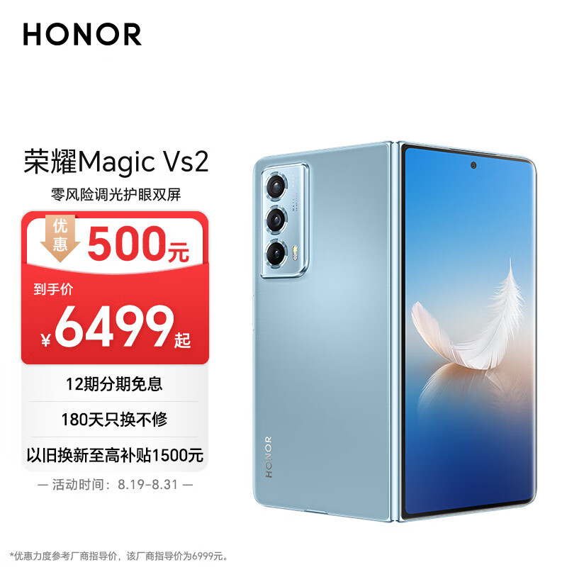 荣耀Magic Vs2 折叠屏 超轻薄设计 零风险调光护眼双屏 骁龙芯片 16+512 冰川蓝 5G 长续航 AI智能手机价格:6499.00元!