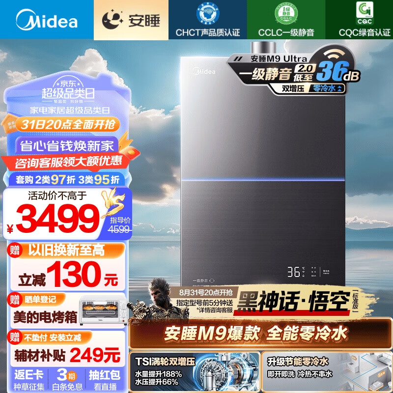 美的(Midea)16升安睡M9燃气热水器天然气 一级静音2.0低噪增容水伺服 无极变频恒温增压零冷水JSQ30-M9 Ultra价格:3499.00元!