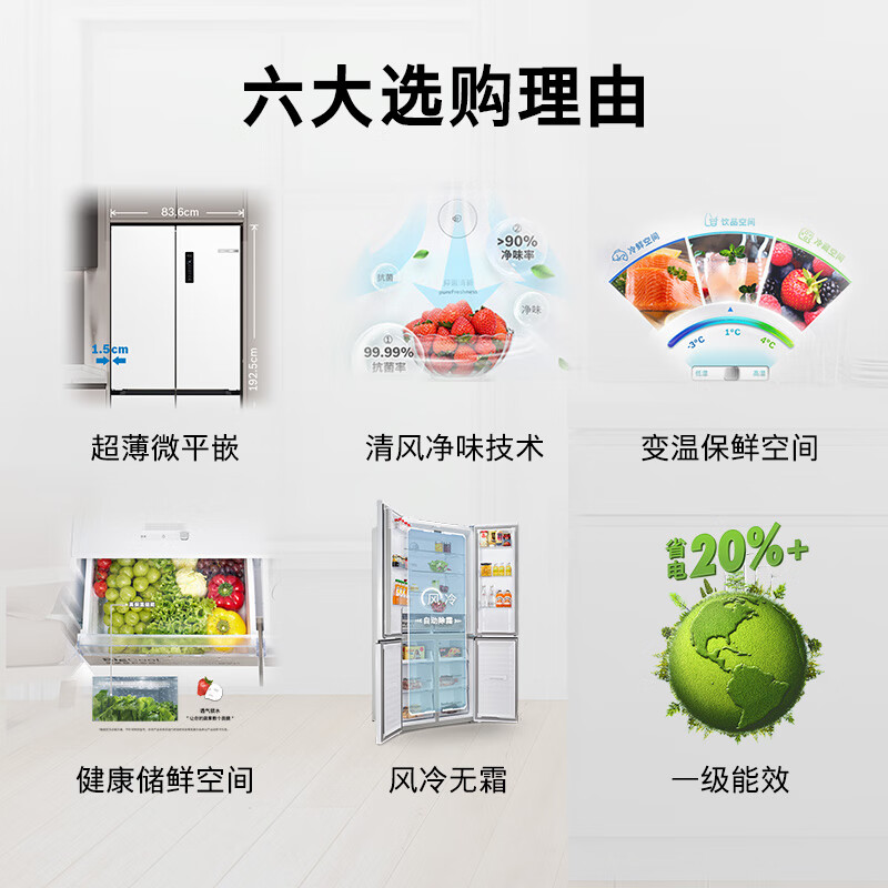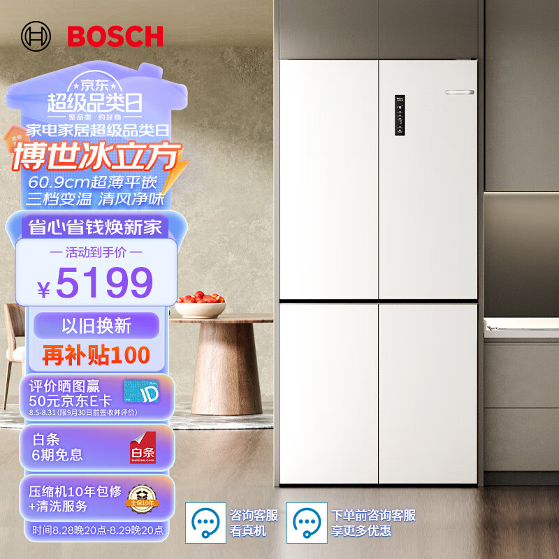 博世(BOSCH)【冰立方】497升十字对开四门超薄微平嵌入式冰箱60.9cm净味变温一级能效白色K1EC49208C超大容量价格:5399.00元!