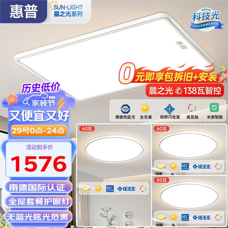 惠普全光谱护眼吸顶客厅卧室灯米家现代简约灯饰中山灯具全屋套餐G价格:2960.00元!