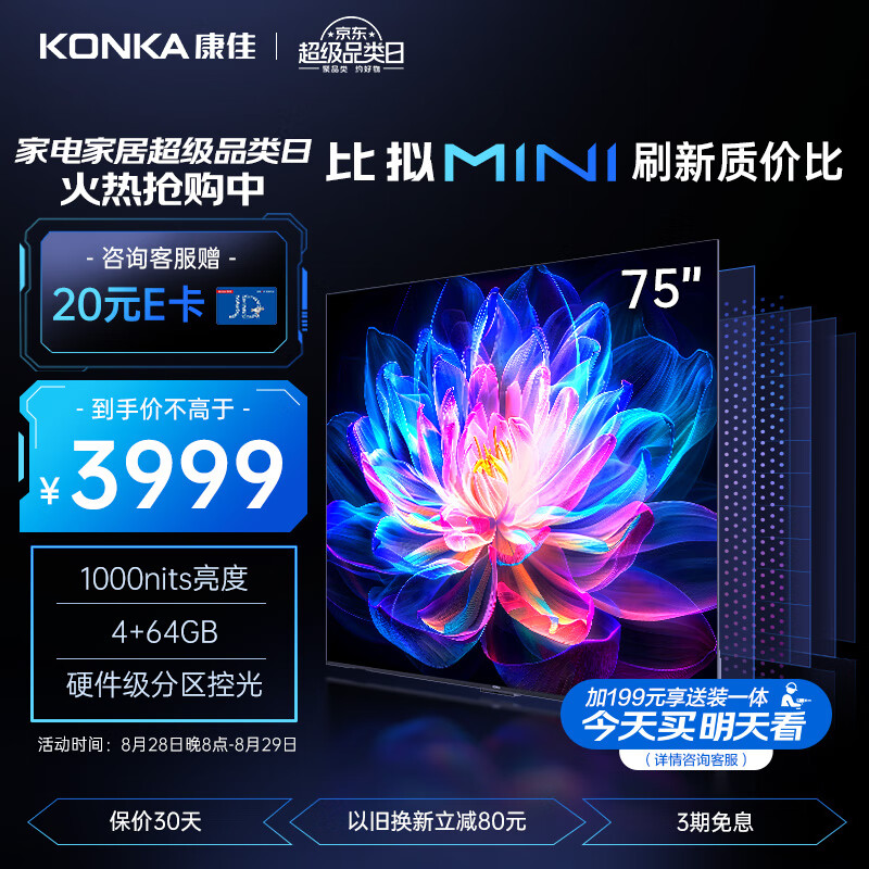 想了解康佳75G7 PRO的质量参数,还有这款的开始销售的时间和用户的评价等等,如果你对此款感兴趣的话,不妨一起来瞧一瞧!电视很好、送货很快!虽然中间因为送货的问题出了点小插曲、但很快解决了!喜欢在京东上买电器!让人放心!售后也好!