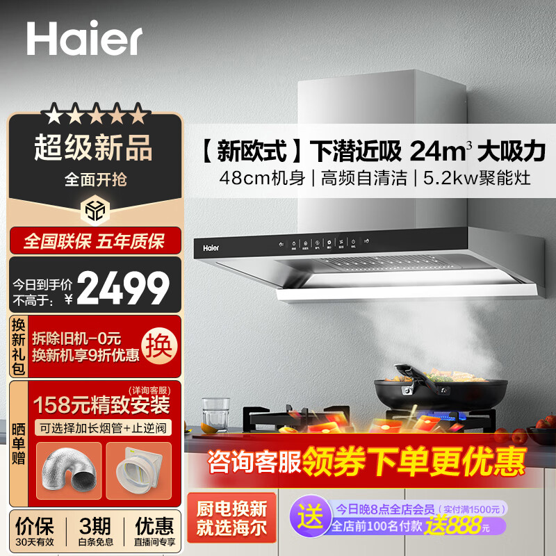 3、618买了新欧式系列下潜近吸油烟机,海尔的售后没话说,很快就给安装好了,还给改了烟道,理顺了方向,使用下来太满意了!!24立方大吸力,比我的旧烟机效果好多了!!