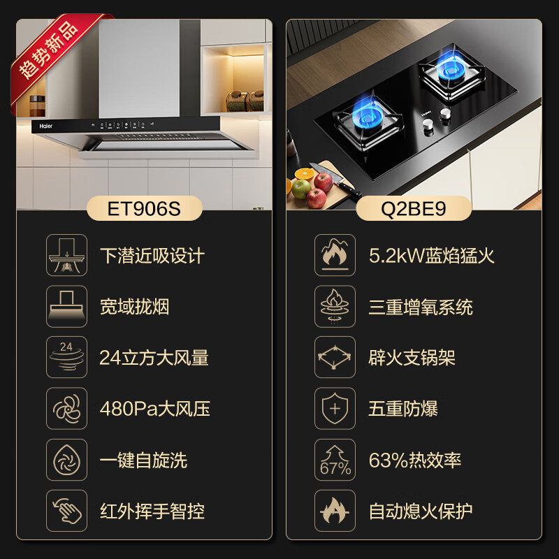 海尔(Haier)油烟机 抽油烟机燃气灶套装 新欧式深潜近吸24立方挥手感应 5.2kw聚能灶烟灶套装ET906S+BE9天价格:2776.00元!