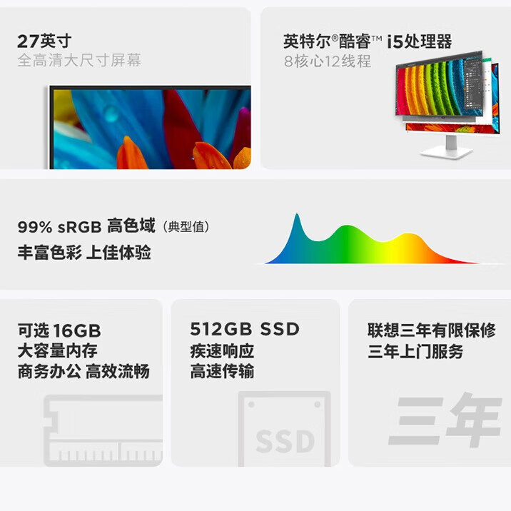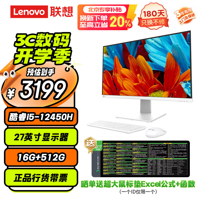来酷联想来酷Lecoo一体台式机电脑27英寸 (12代酷睿i5-12450H 16G 512G SSD ) 白 无线键鼠 支持壁挂价格:3199.00元!