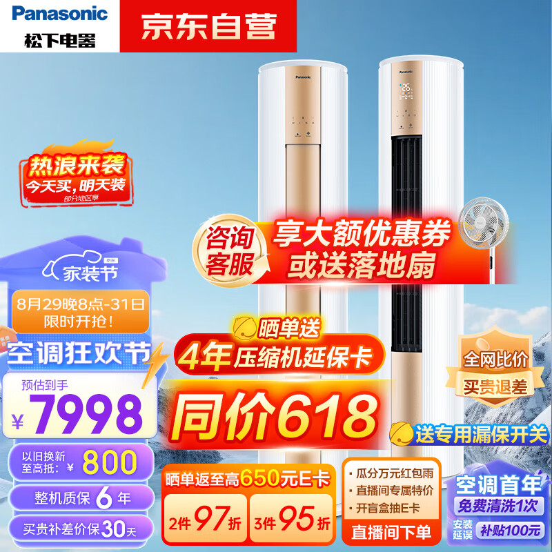 松下空调 净悦星3匹新三级能效 圆柱立式柜机客厅空调变频 纳诺怡除菌洁净 WiFi 以旧换新 ZY72F330N价格:7998.00元!