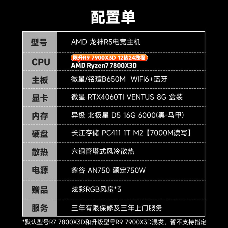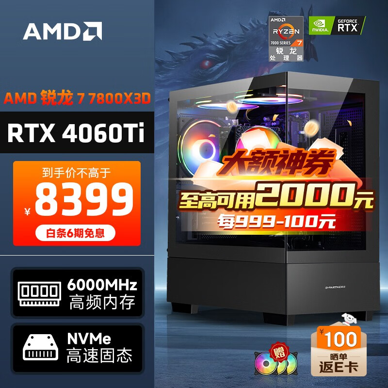AMD龙神 锐龙R7 7800x3D/RTX4060Ti 8G/16G 6000MHz/1TB SSD 电竞游戏设计师台式电脑主机diy组装整机价格:9299.00元!