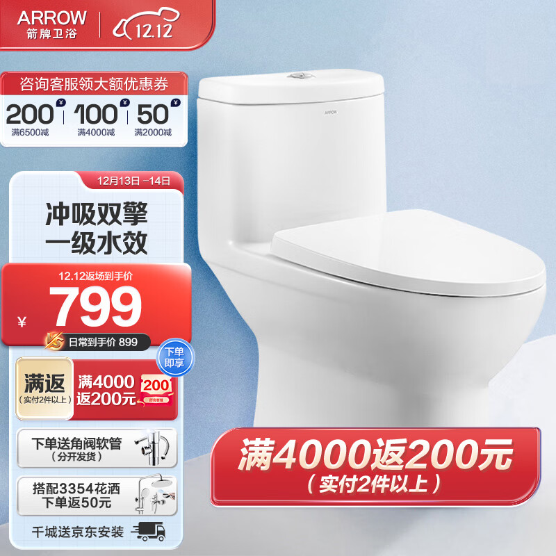 箭牌箭牌(ARROW)马桶家用卫浴虹吸连体坐便器座便 小户型卫生间坐厕 微晶釉面 1级水效AE1126T配置参数:
