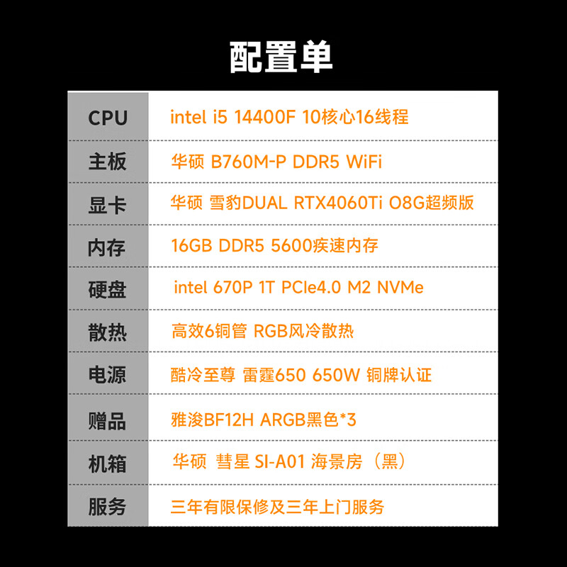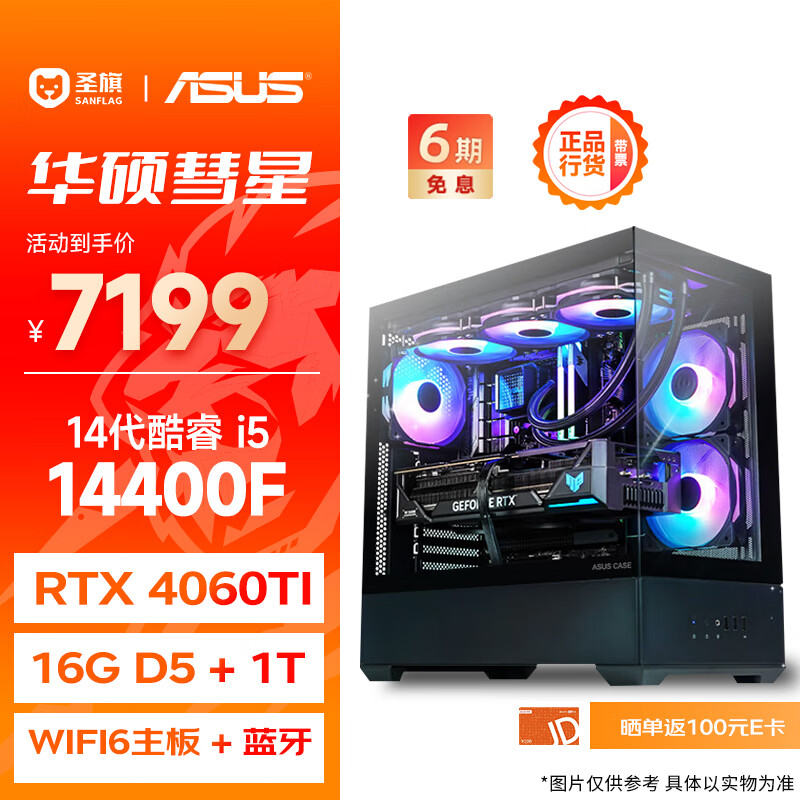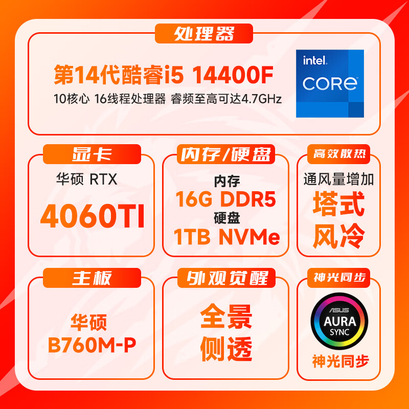 圣旗华硕(ASUS)i5 14400F/RTX4060Ti显卡/16G D5/1T黑神话悟空电竞游戏台式电脑主机diy组装整机 价格:8499.00元!