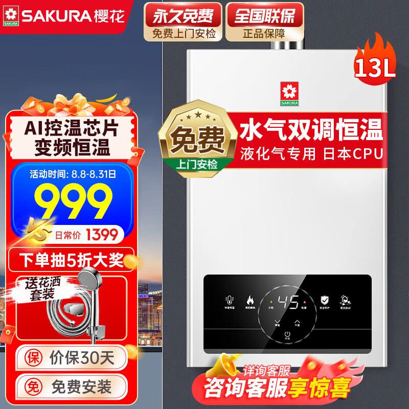 樱花(SAKURA)燃气热水器水气双调智能精控恒温直流变频降噪触控强排式热水器低压启动多重防护 13L NJP007S液化气价格:1299.00元!