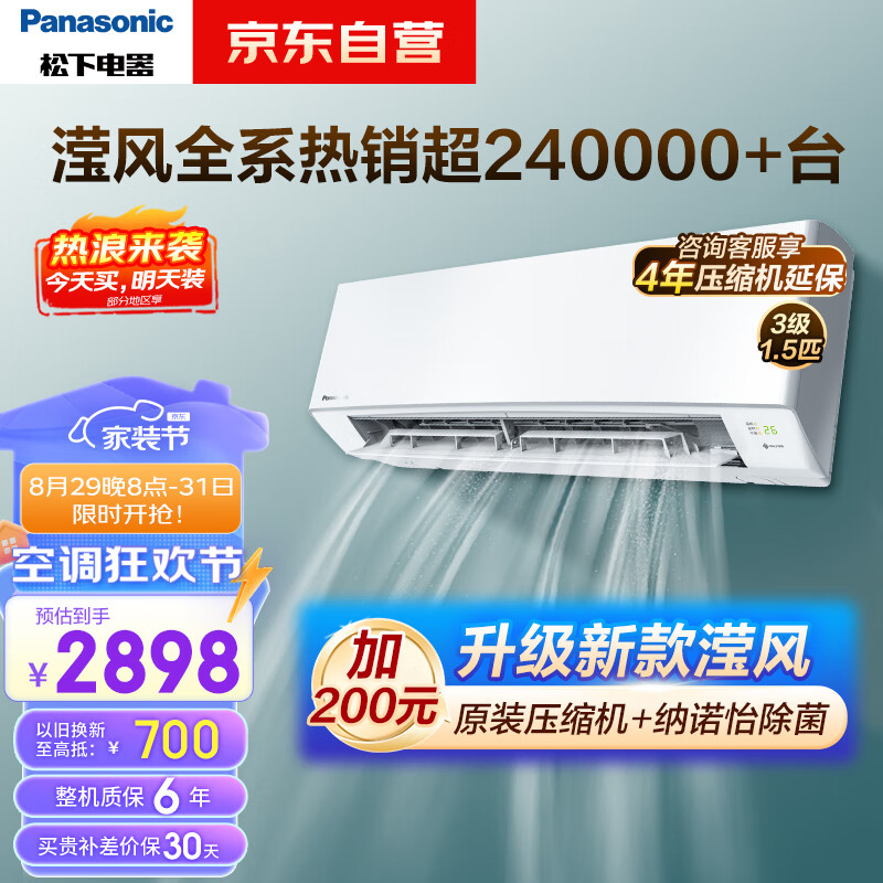 松下空调滢风系列 1.5匹 新三级能效 变频冷暖壁挂式空调挂机 强速冷暖WIFI智能 ZY35K230 以旧换新价格:3036.30元!