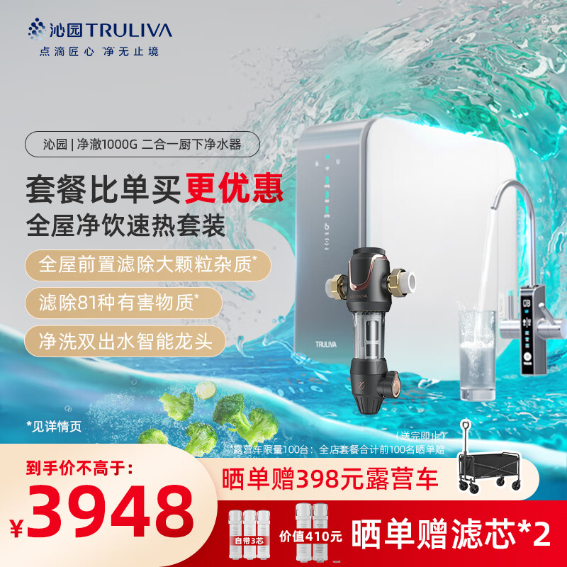 沁园(TRULIVA)净澈双出水1000G二件套装 净水器UR-SX51070+前置过滤器P-A5510(黑)价格:3948.00元!