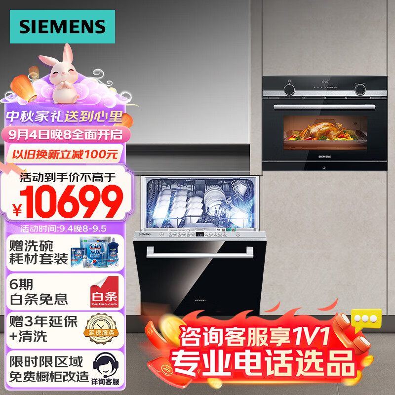 西门子洗嵌套装 14套嵌入式家用洗碗机+嵌入式微蒸烤炸一体机组合套装 SJ436(含黑门板)+CP565价格:10698.00元!