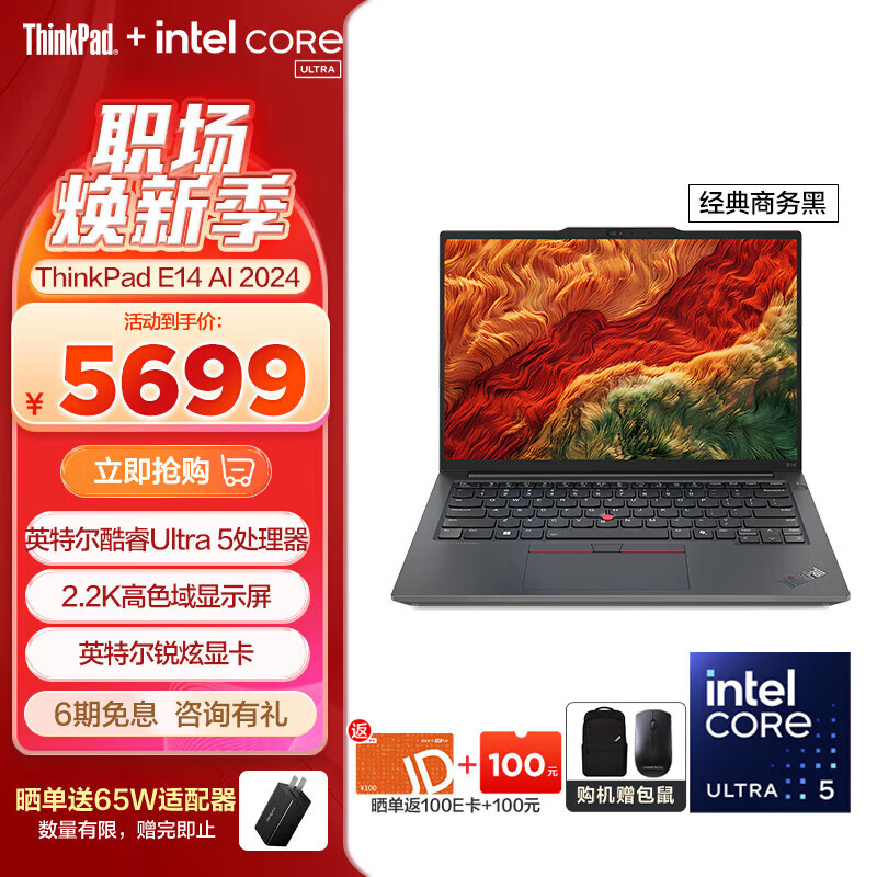 ThinkPad 联想 E14 AI 2024全新英特尔酷睿Ultra处理器可选 商务办公便携笔记本电脑 14英寸轻薄本 Ultra 5-125H 16G 512G商务黑价格:6299.00元!