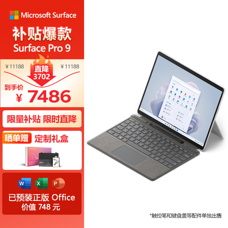微软Surface Pro9 二合一平板电脑 i5/16G/256G亮铂金13英寸触控学习机 高端办公 游戏轻薄 笔记本电脑价格:7488.00元!