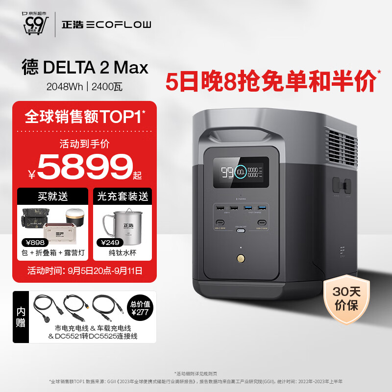 ECOFLOW正浩【2度电快充】德2max移动户外电源220V 大功率大容量车载自驾露营停电应急储能备用电源电池价格:6499.00元!