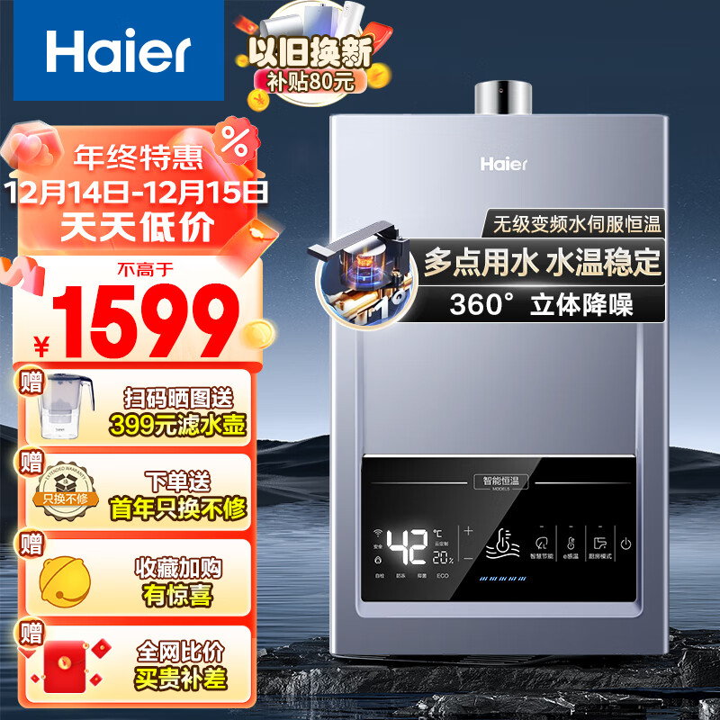 海尔(Haier)16升燃气热水器天然气升级无级变频水伺服恒温静音降噪家用JSQ30-16MODEL5(12T)U1【以旧换新】价格:1799.00元!