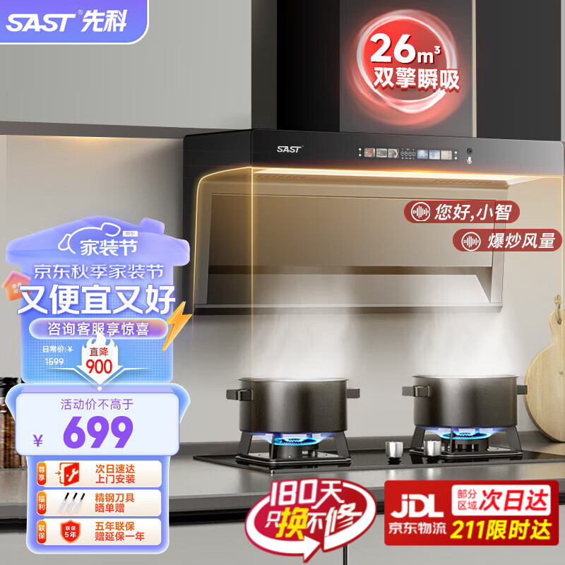 先科(SAST)顶侧双吸抽油烟机燃气灶烟灶套装家用厨房大吸力脱排式7字吸油烟机灶具套装 行业爆款/26立方爆吸+语音+彩屏+LED大灯价格:1499.00元!