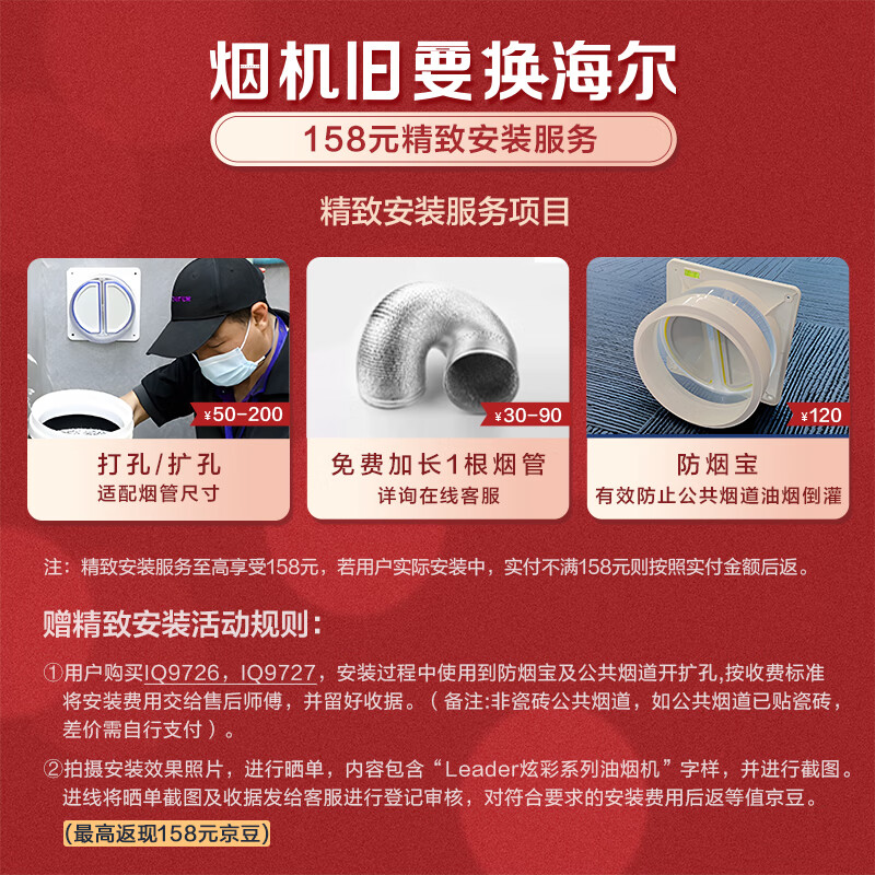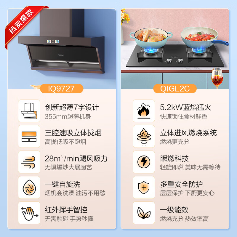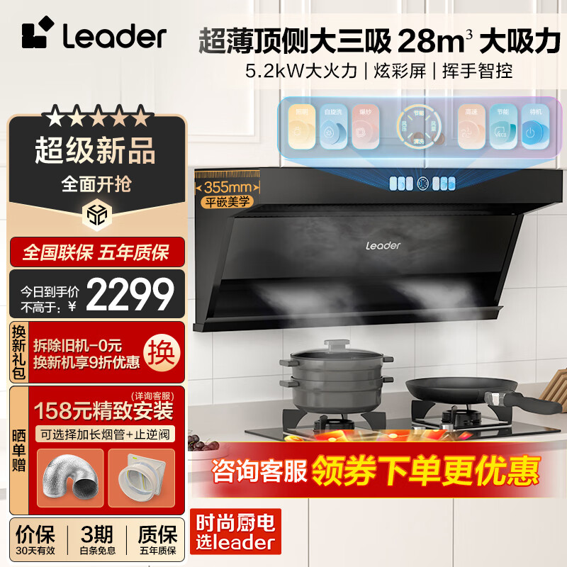 海尔(Haier)抽油烟机 顶侧双吸 三腔速吸烟灶套装 28立方大吸力 Leader 彩屏智控齐平橱柜IQ9727天价格:2299.00元!