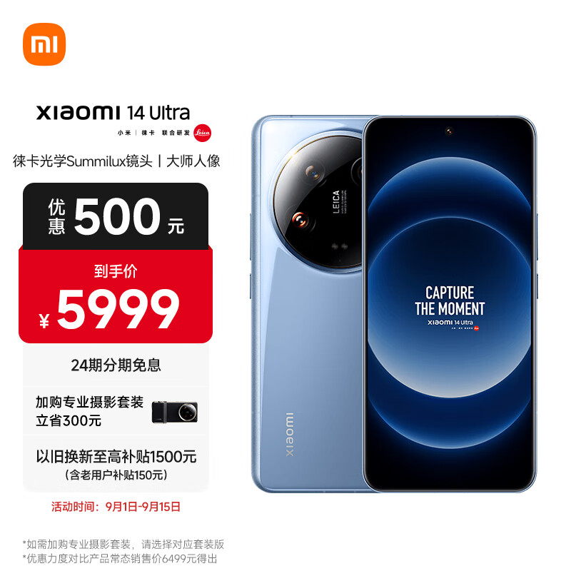小米Xiaomi 14Ultra 徕卡光学Summilux镜头 大师人像 双向卫星通信 第三代骁龙8 12+256 龙晶蓝 5g手机价格:5999.00元!