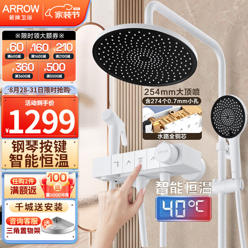 箭牌(ARROW) 淋浴花洒套装增压花洒全套莲蓬头淋雨器套装浴室花洒按键花洒 【钢琴白】按键丨恒温款价格:1709.00元!