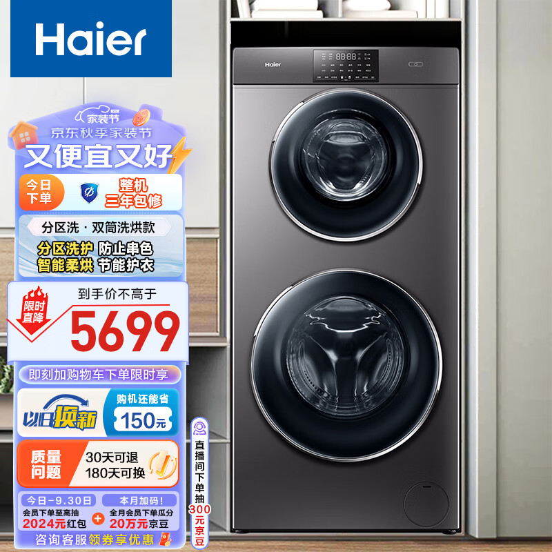海尔滚筒洗衣机全自动 洗烘一体机 双子双筒分区洗 4+9公斤【XQGF130-HB1258U1】母婴内衣 以旧换新价格:5699.00元!