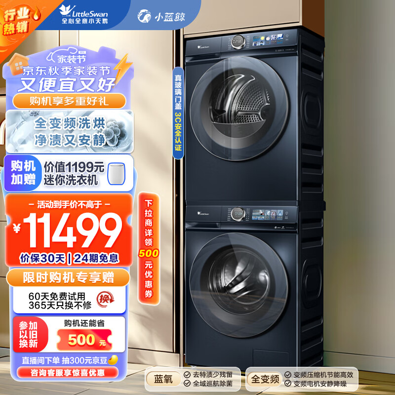 小天鹅(LittleSwan)洗烘套装 10KG滚筒洗衣机+热泵烘干机 超薄全嵌 蓝氧【小蓝鲸MAX全变频】TG100V88PLUS+88PLUSMAX价格:11499.00元!