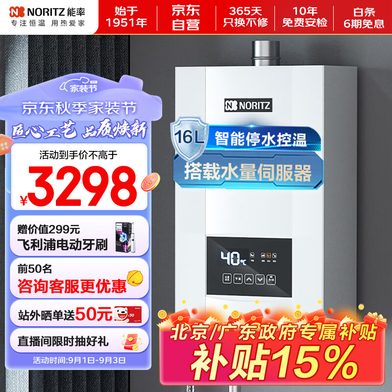 能率(NORITZ)16升燃气热水器天然气 恒温水伺服 综合降噪 速热大水量 停水控温 以旧换新GQ-16E4AFEX(JSQ31-E4)价格:3098.00元!