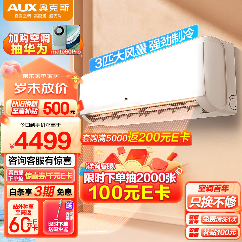 奥克斯(AUX) 空调3匹 三级能效 挂机 自清洁 冷暖两用 家用壁挂式 变频 (KFR-72GW/BpR3ZAQK(B3))价格:4499.00元!