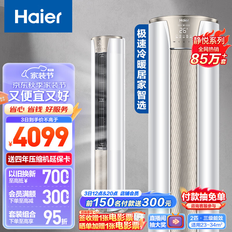 海尔(Haier)2匹 静悦 变频新能效 客厅圆柱空调立式柜机自清洁 立式空调 KFR-50LW/06KCA83U1 以旧换新价格:4099.00元!