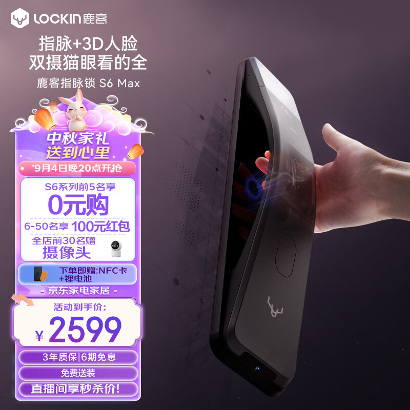 鹿客(lockin)S6 Max指脉锁人脸识别双摄4.7英寸猫眼屏电子锁智能门锁价格:2899.00元!