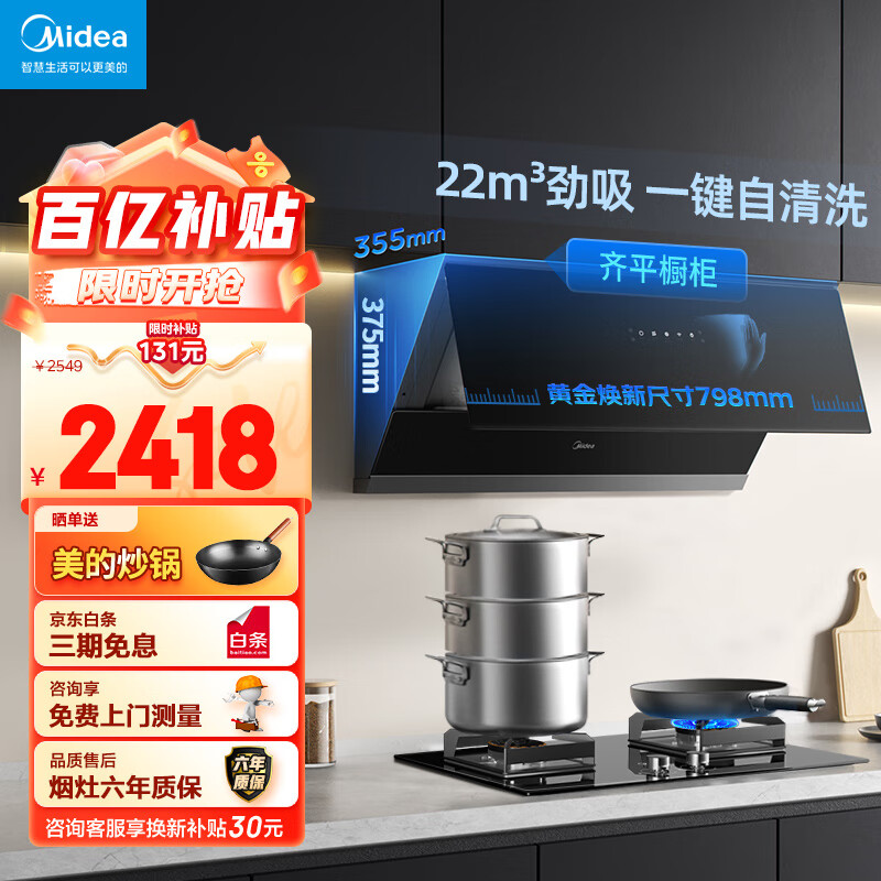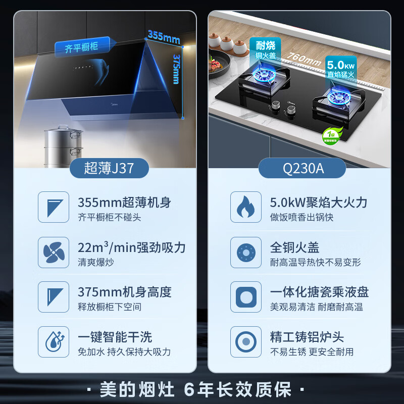 美的(Midea)抽油烟机灶具套装 家用厨房小尺寸侧吸式22吸力挥手自清洁超薄烟机 5kW燃气灶J37+Q230A天然气套装价格:2418.00元!