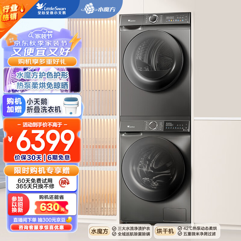 小天鹅(LittleSwan)水魔方洗烘套装 10KG滚筒洗衣机全自动+热泵烘干机 除菌除螨 TG100V618T+617MAX价格:6399.00元!