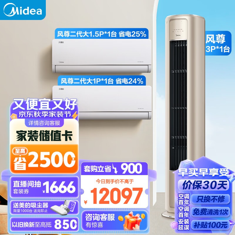 美的(Midea)空调 风尊系列 温馨二居套餐 两室一厅套装(大1.5匹风尊二代+大1匹风尊二代+3匹风尊柜机)价格:12997.00元!