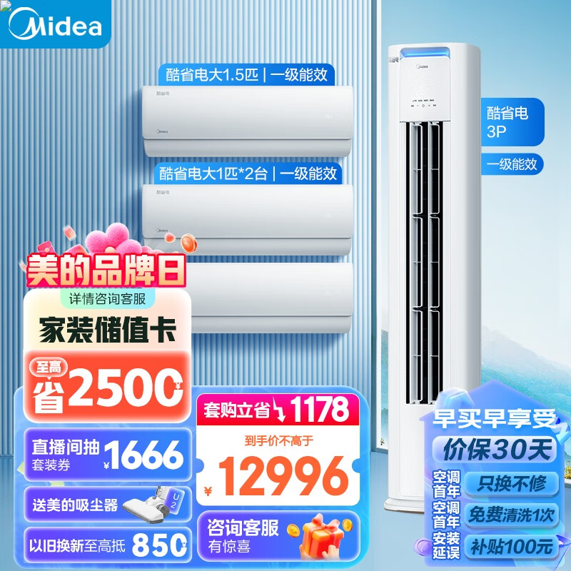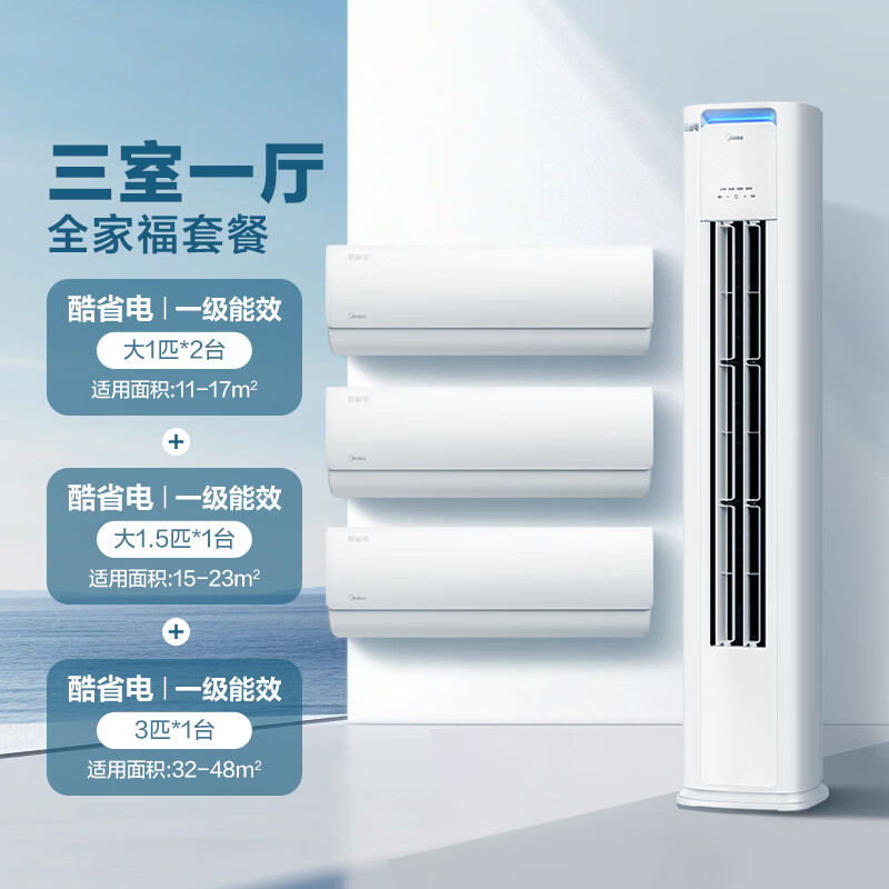美的(Midea)空调 新一级能效 酷省电 空调套装 三室一厅 全家福套餐(大1匹*2+大1.5匹+3匹)价格:14174.00元!