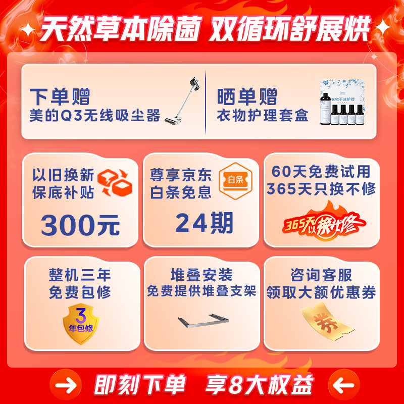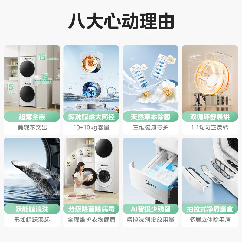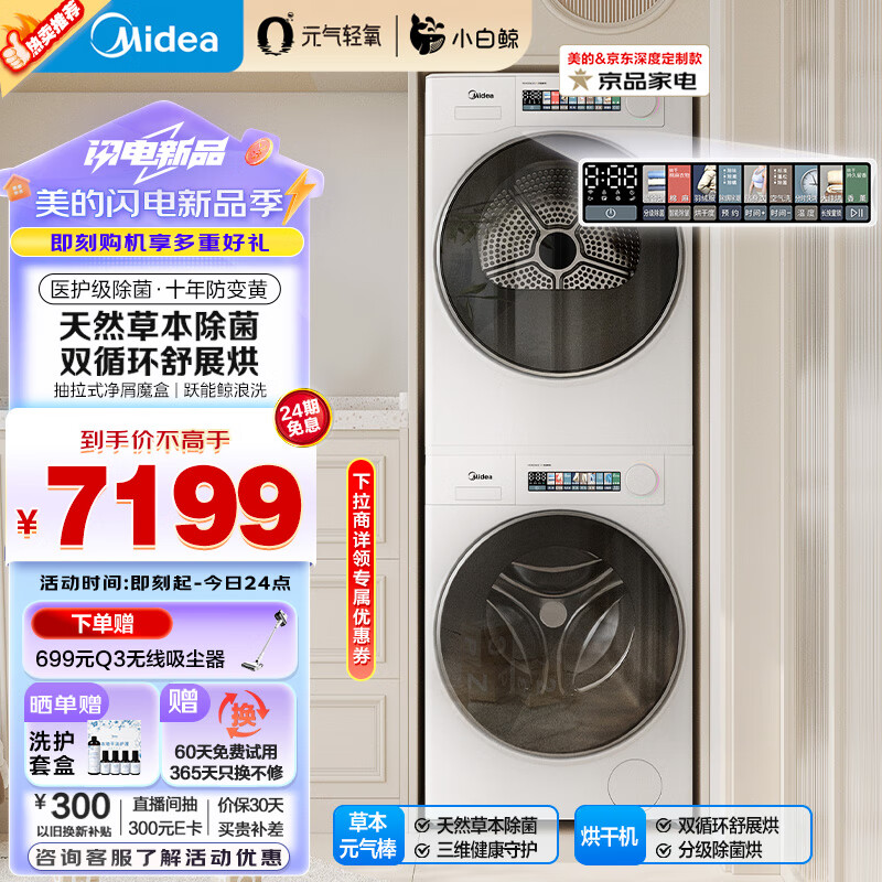 美的(Midea)洗烘套装 10公斤滚筒洗衣机全自动+热泵烘干机 超薄大筒径 草本元气棒 【小白鲸】MG100WJ3+WJ3价格:7199.00元!