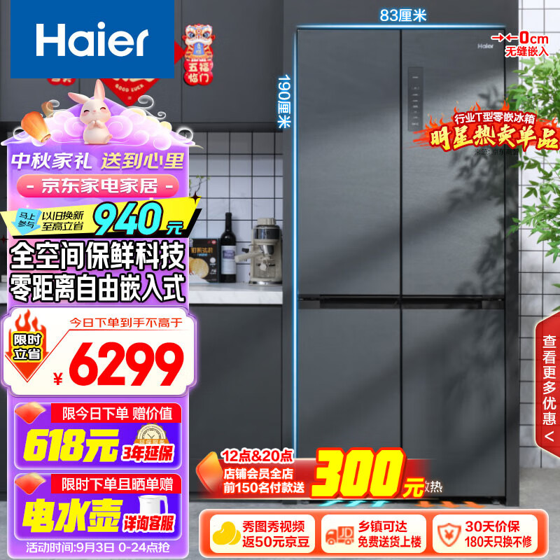 海尔(Haier)505L全空间保鲜零距离自由嵌入式十字对开四开门电冰箱家用无霜超薄一级能效BCD-505WGHTD14S8U1价格:6799.00元!