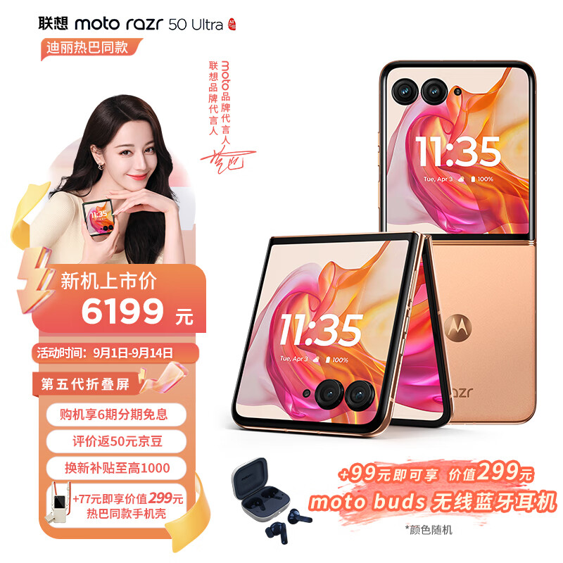 摩托罗拉 联想moto razr 50 Ultra 第五代折叠屏 4吋无界大外屏 双卡 5G手机 AI元启版 12+512GB 柔和桃价格:6199.00元!