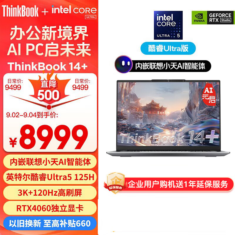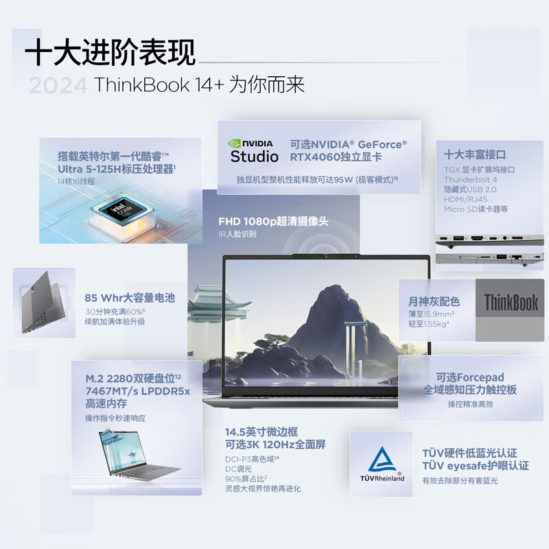 ThinkPad联想笔记本电脑ThinkBook 14+ 2024 AI全能本 英特尔酷睿Ultra5 125H 14.5英寸 32G 1T 3K RTX4060价格:8999.00元!