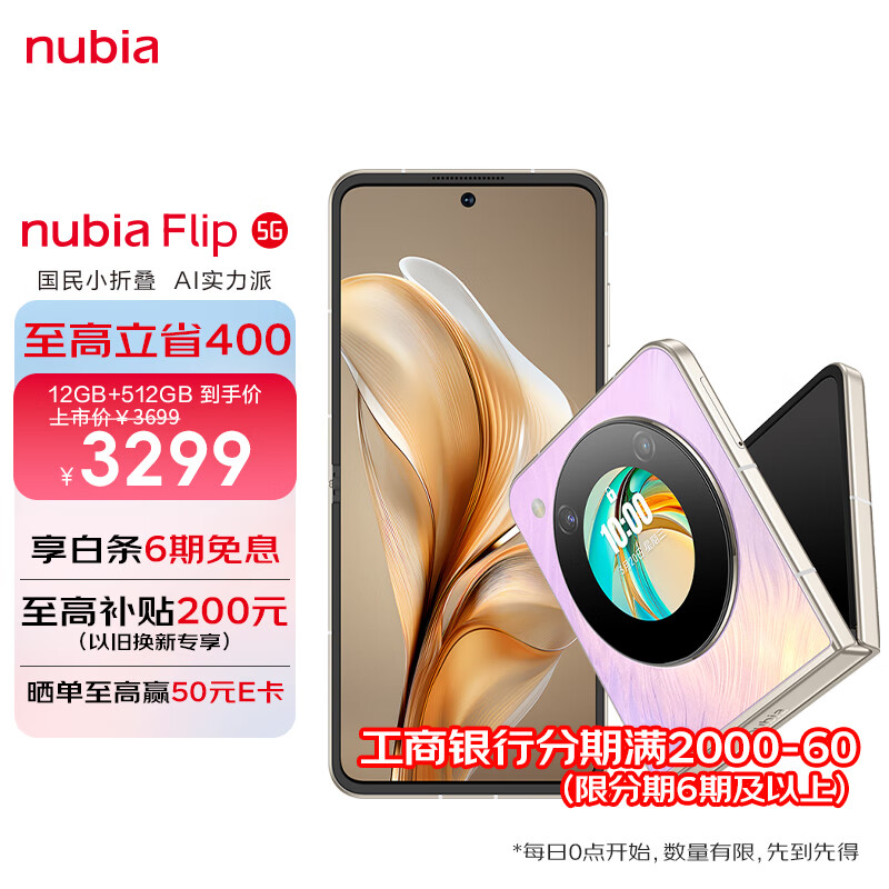努比亚(nubia)Flip 12GB+512GB 香芋色 高通骁龙芯片 5000万后置双摄 120Hz屏 5G拍照AI小折叠屏价格:3299.00元!