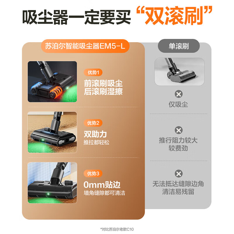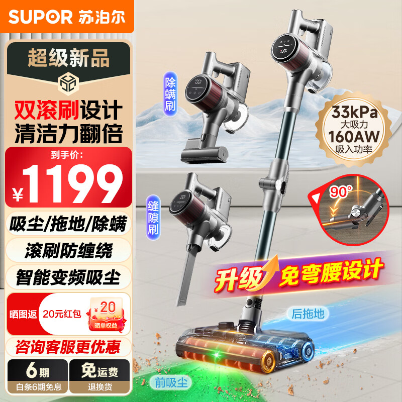 苏泊尔(SUPOR)吸尘器家用洗地机手持无线吸拖一体免弯腰33kpa大吸力双滚刷长续航除螨宠物吸毛绿光显尘EM5-L价格:1299.00元!